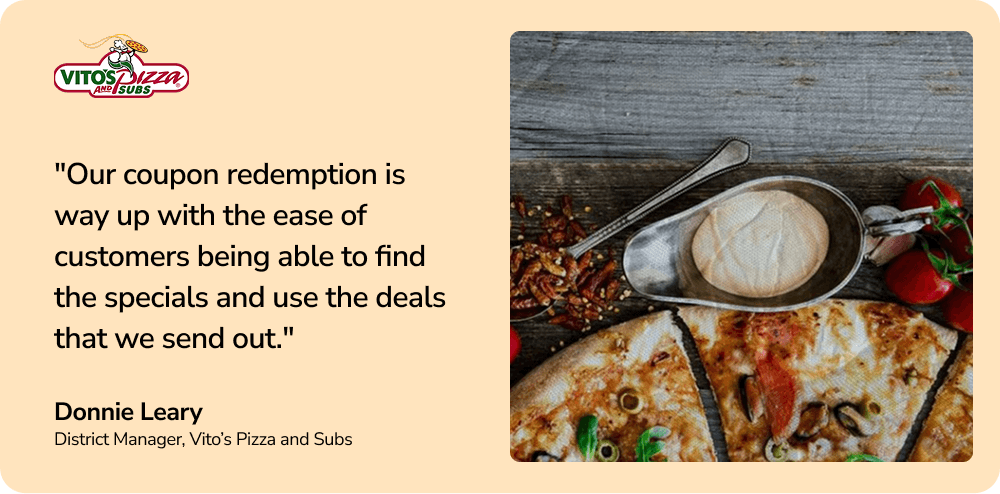 An effective loyalty program should be tightly integrated with your POS system, online ordering platform, and mobile app. This creates a seamless experience, allowing customers to easily sign up, earn, and redeem rewards with every purchase, no matter how they order. As Donnie Leary, District Manager at Vito’s Pizza and Subs, says, “Our coupon redemption is way up with the ease of customers being able to find the specials and use the deals that we send out.”