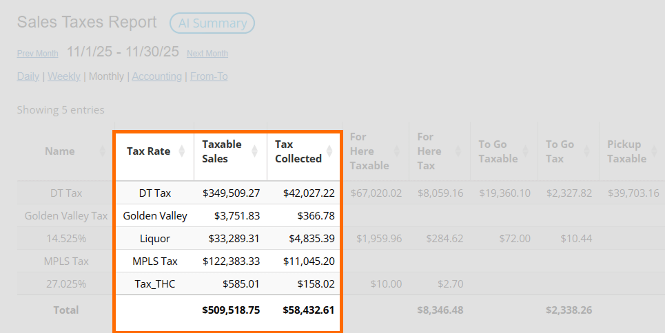 You’ll find this report in FoodTec under the names “Tax Summary” and “Tax Detail.”